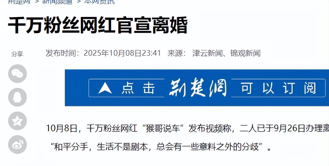 千万粉丝网红“猴哥说车”和何钰欣的离婚,终于尘埃落定了。2025�񀙘日,两人同步发视频官宣,񗞑�号已经办完了离婚手续。这对曾被网友夸“神仙眷侣”的夫妻,结婚三年还是散了场。